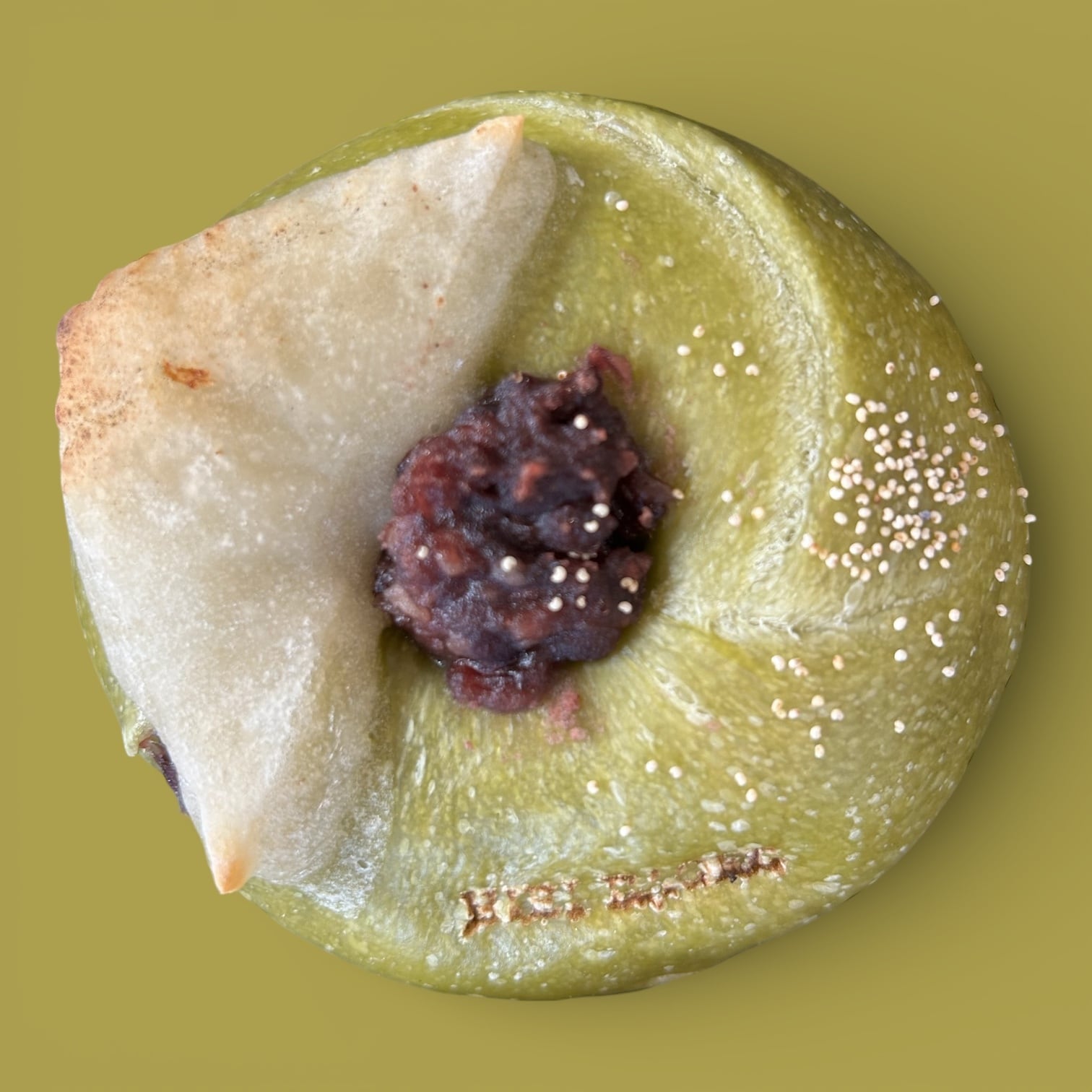 抹茶生地に、甘酒あんとお餅の相性。